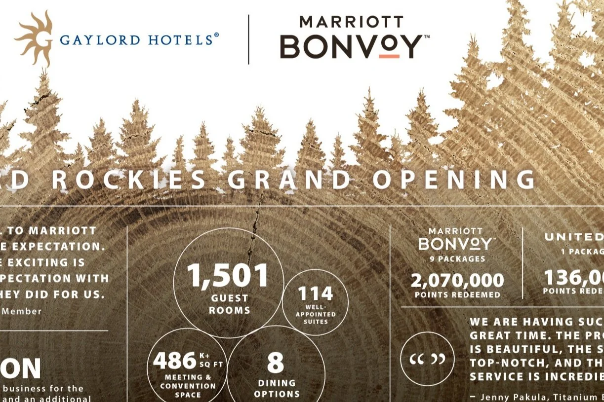 After an inspirational grand opening for the largest combined resort and convention center in Colorado—the Gaylord Rockies Resort & Convention Center—an infographic was developed to summarize the success of the event. Design elements were utilized from the opening and content was meticulously organized to highlight the most relevant information.
